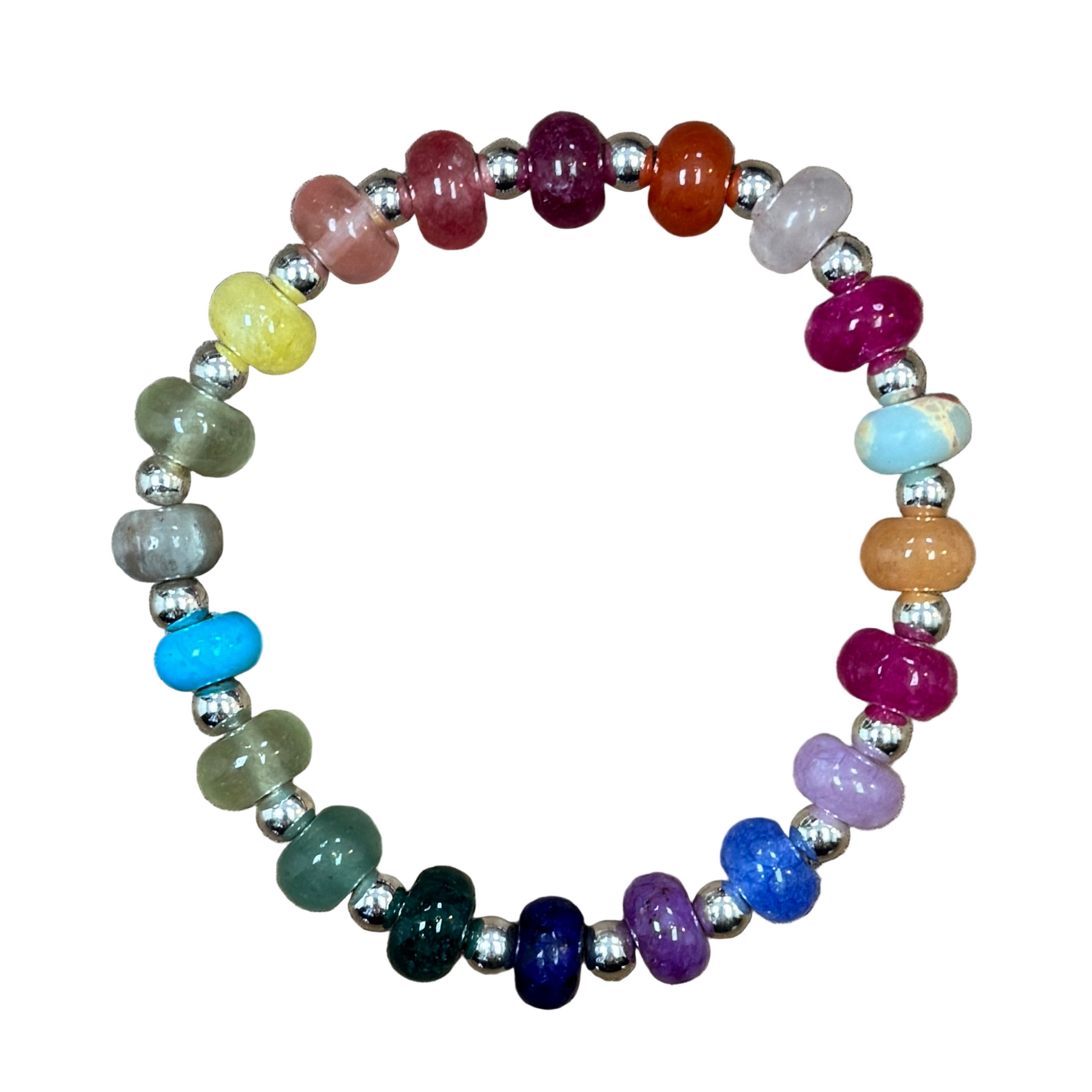 Add a pop of color to your outfit with our Rainbow Mix Rondelle Silver Ainsley Bracelet. Featuring a playful mix of vibrant colors, this bracelet is the perfect accessory for any occasion!