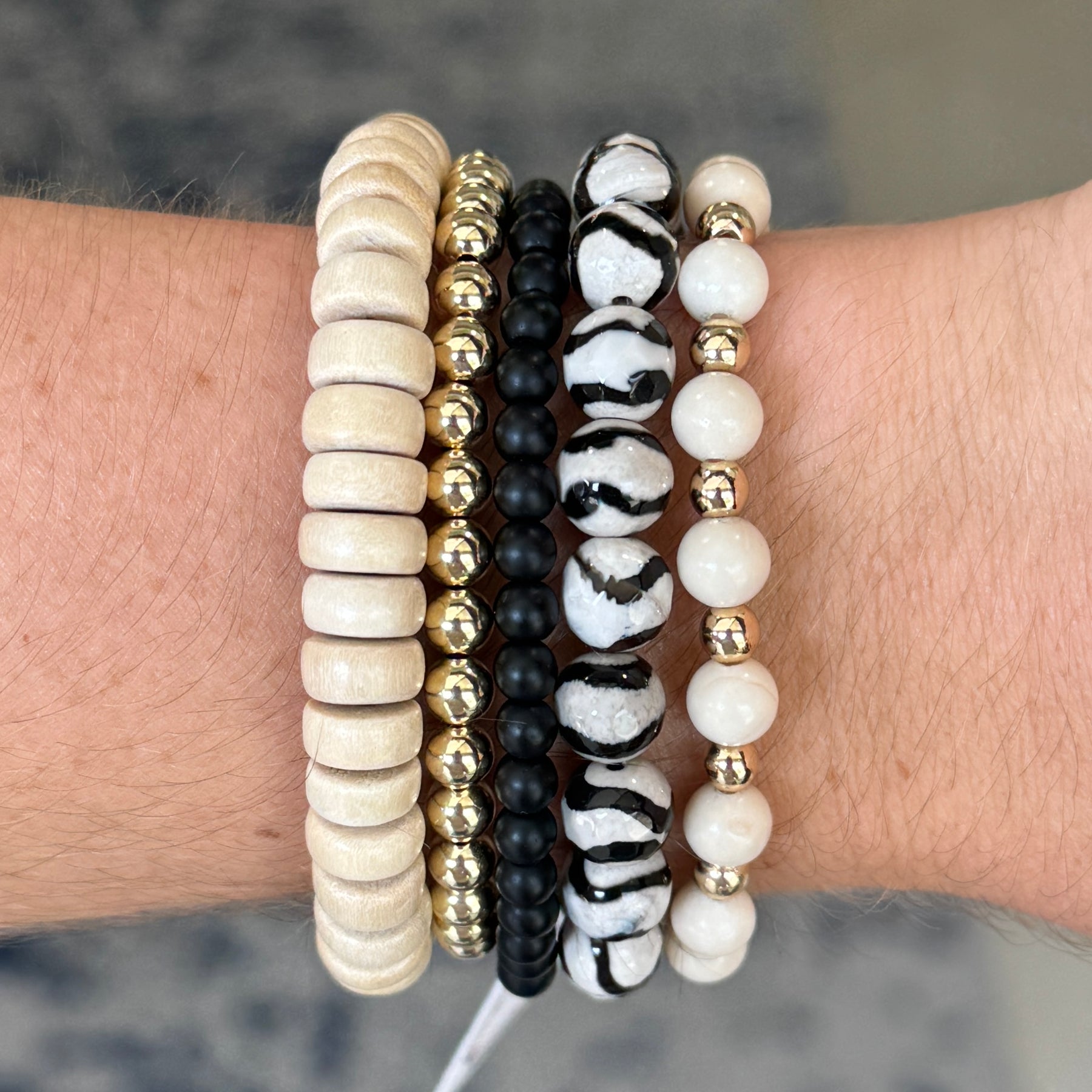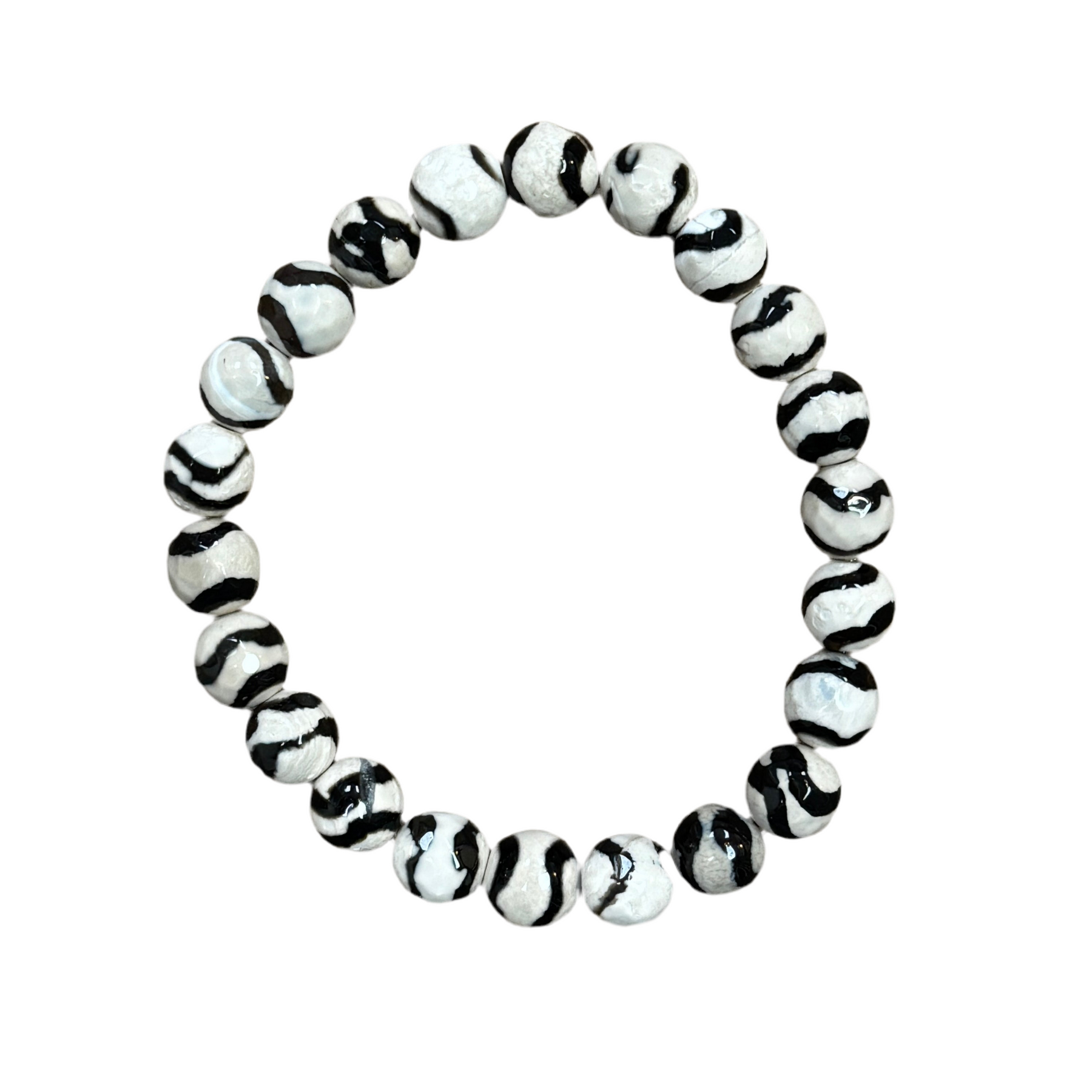 We are obsessed with this Wavy Striped Tibetan Agate 8mm Bracelet!! This is a unique twist to the classic black and white look by adding cream and black wavy stripes. Make sure to pair this with your other animal print bracelets. Looks great with neutrals and with pops of color. Such a fun bracelet!