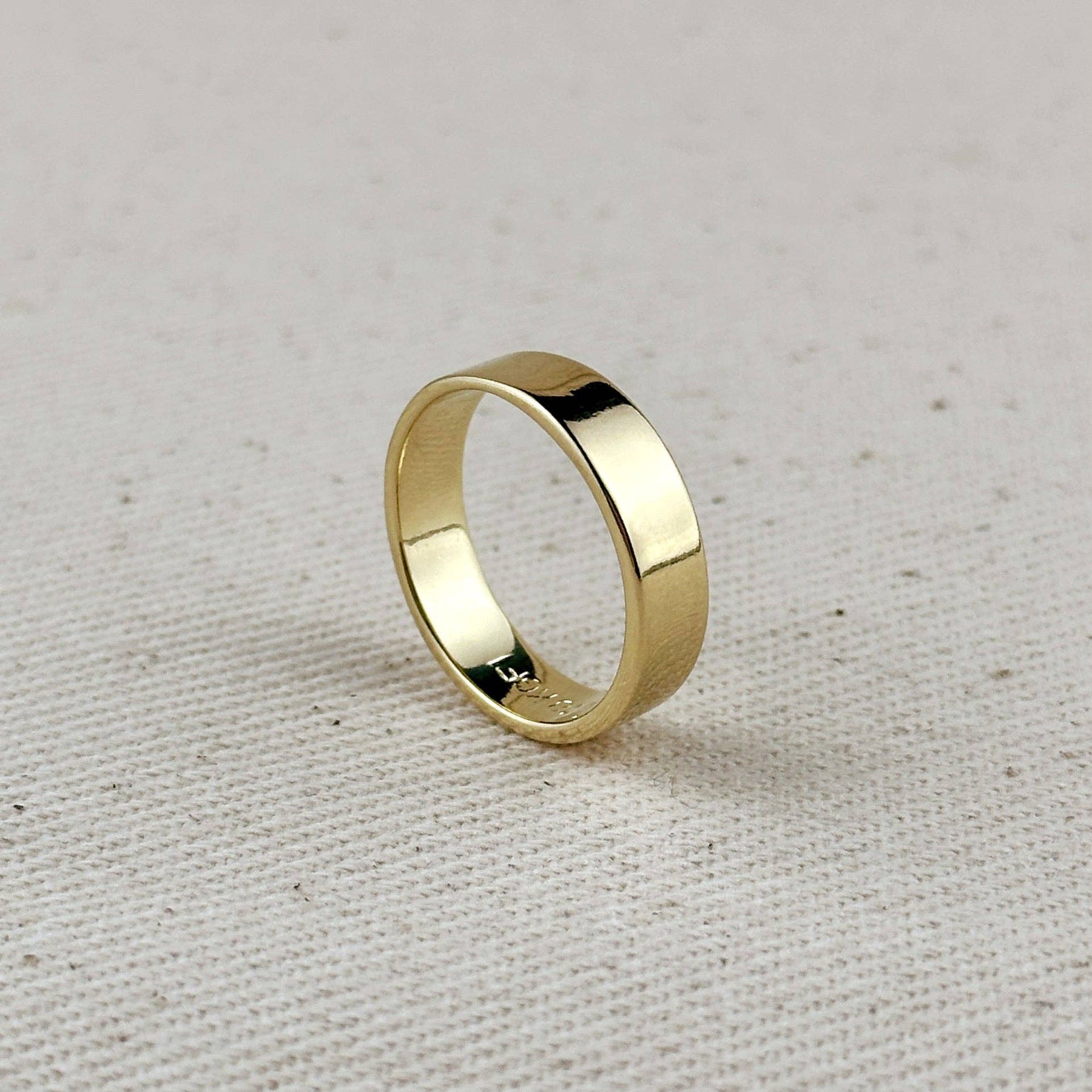 Discover timeless elegance with our 18k Gold Filled Polished Flat Band Ring. This exquisite ring showcases a sleek and minimalistic design, featuring a flawlessly polished flat band that exudes a sophisticated shine. Crafted from high-quality 18k gold-filled material, it combines durability with luxurious style, offering the appearance and feel of solid gold at an accessible price. Perfect for both men and women, this versatile ring can be worn alone for a classic, understated look or stacked with other rings to create a trendy, layered effect. Whether as a wedding band, a promise ring, or a stylish accessory for everyday wear, this polished flat band ring is a must-have addition to any jewelry * Metal: 18k Gold filled * Size: 5mm wide band * Hypoallergenic * Water-resistant * Handcrafted in Brazil