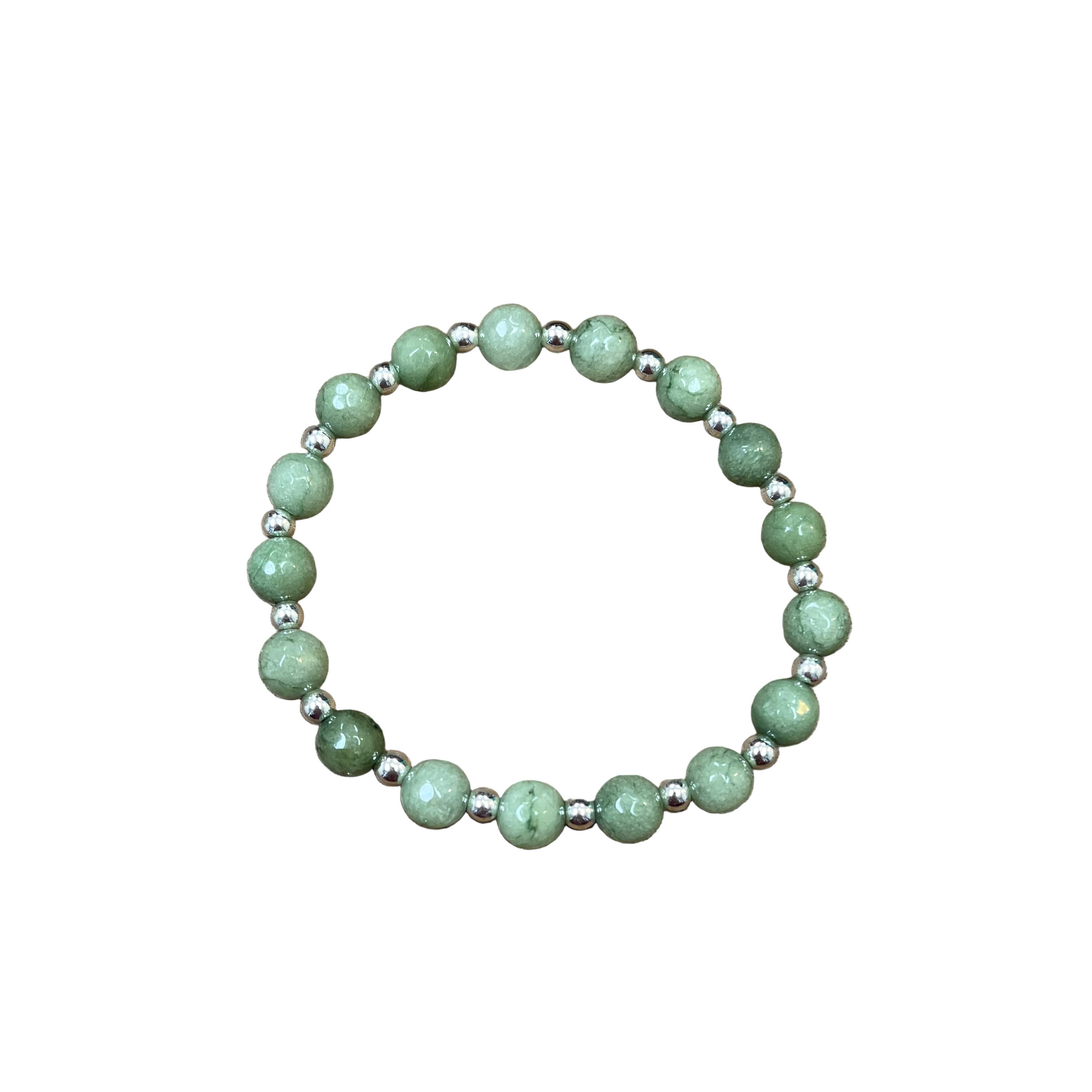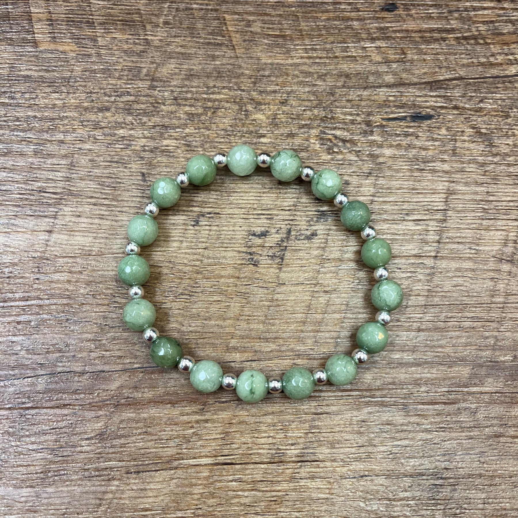 Elevate your style with the luxurious Olivine Faceted Jade Silver Hematite Ainsley 8mm bracelet. Featuring olive and gold beads, this bracelet is a subtle way to add a touch of olive to your outfit.