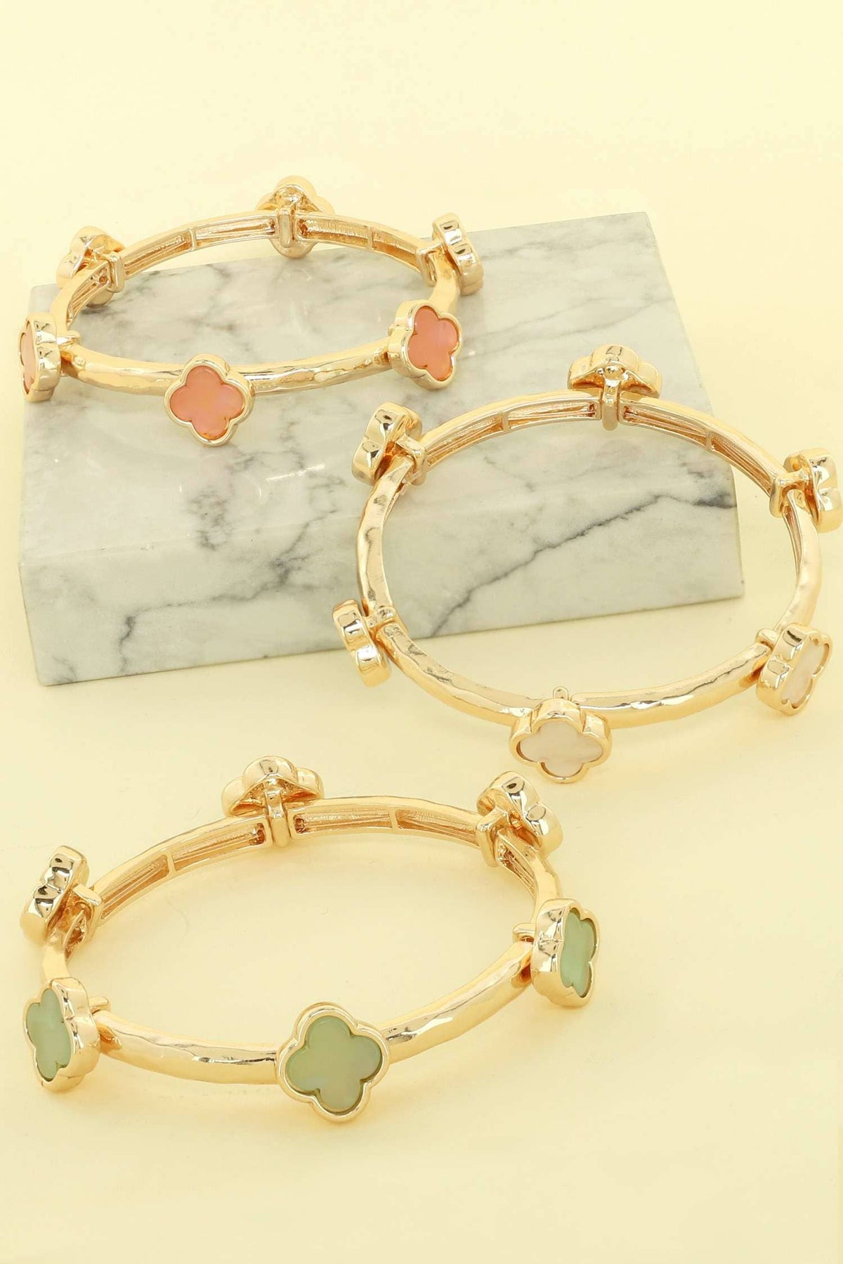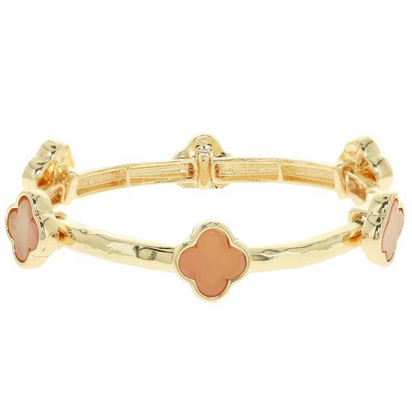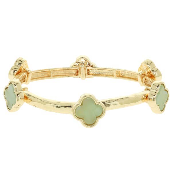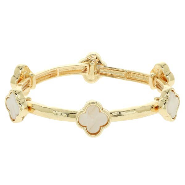 Get ready to glam up your outfit with our Clover Mother of Pearl Gold Flexible Bangle! The polished pearlescent epoxy adds a touch of elegance, while the gold-tone metal gives a classic look. Plus, the stretch design allows for a comfortable and flexible fit. Shine bright with this stylish and versatile bracelet.
