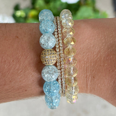 Make a bold statement with this stunning 10mm gold pave blue crackle glass bead. Its unique combination of blue glass and glittering gold pave adds instant glamour to any look!